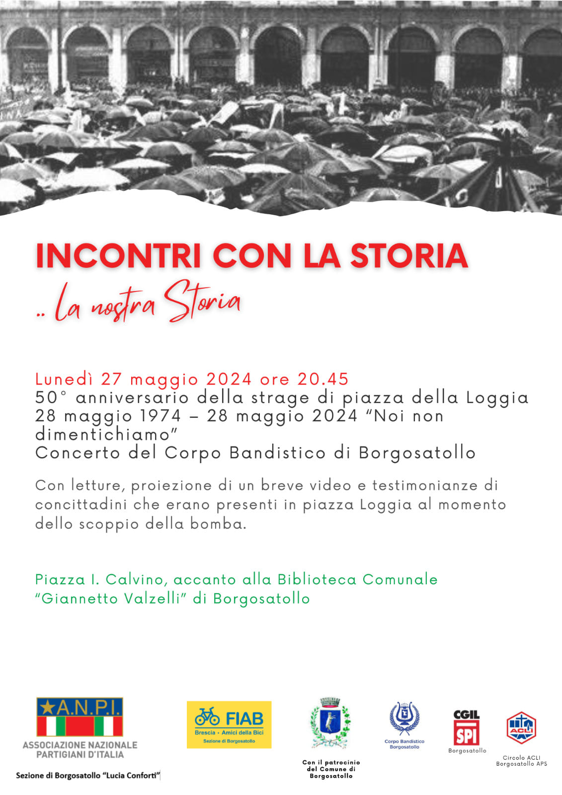 Concerto in Memoria della Strage di Piazza Loggia Categoria: Eventi Lunedì 27 Maggio Ore 20:45 Borgosatollo Allegati: locandina Tutti gli articoli